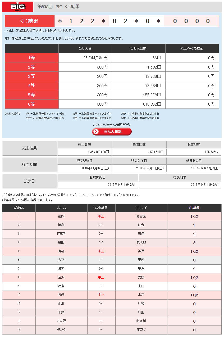 この結果、BIG1000はくじが成立せずに払い戻し、辛うじて成立したBIGも以下のような結果になった。