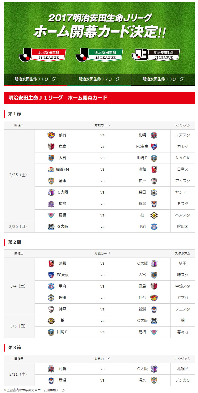 Jリーグから2017シーズンホーム開幕戦の情報が発表された。